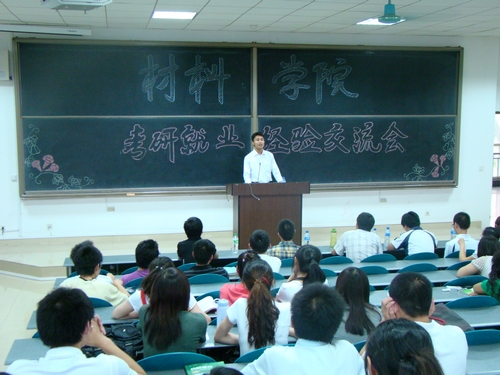 为更好地解决材料学院学生考验与就业方面的疑惑,以使大家更加明确自己未来的方向,5月28日晚,材料学院于图书馆东侧1103教室顺利举行考验就业经验交流会。材料学院团委副书记杨树老师和09级辅导员吕志胜老师出席了本次交流会,同时参加本次会议的还有材料学院06级已经考研的李小成同学、郑国朋同学、黄振同学、韩茜同学、刘状壮同学和即将就业的魏子杰同学、李蓉同学、杨翔思同学。会议由材料学院团委副书记尚秀琳同学主持。