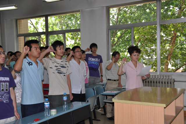 首先,全体起立唱国歌。接着林老师带领全体毕业生党员面对鲜红的党旗,重温了神圣而又庄严的“入党誓词”,并举行宣誓仪式,现场气氛庄严而隆重。接着,王宇同学及张辰姊同学作为毕业生党员代表,向全体毕业生提出了文明离校的倡议,并饱含感情地表达了毕业生对母校深深的眷恋,更有对未来的踌躇满志。朴实的语言和真挚的情感赢得了全场老师与学生的热烈掌声,唤起全体学生党员的党员意识,进一步加强了党性教育。