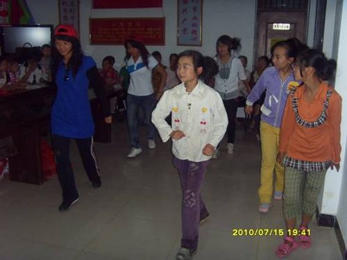 7月15日,服务团成员早上冒着雨在村委会广场教孩子们跳健美操、健康舞、手语等表演节目,并且对孩子们的朗诵做了最后的辅导。孩子们很努力,很认真,在短短的几天中孩子们就学会了好几个舞蹈。上午在忙碌的训练中度过了。中午服务团开了个座谈会,将比赛的流程做了细致的安排,责任到人。下午两点,运动会正式拉开帷幕。因雨过大,儿童组抢凳子比赛在室内进行。雨小点之后,女子组抢凳子比赛改在了室外进行。乒乓球、篮球投篮比赛在雨中进行。由于后来由小雨转中雨,考虑到安全问题,接力赛被迫取消。每项运动产生的前三甲的颁奖均放到晚上晚会结束后举行。