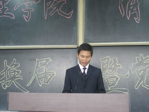 首先,院团委书记 吴 老师宣读本届学生组织主要干部名单。接下来,前任学生会主席对上学年学生会工作做了详细的总结,并对本届学生组织表达了强烈的期望。随后,我院现任学生会主席代表学生干部发言,他介绍了学生组织新学年的发展方向及工作思路,并表达了承前启后、开拓创新的决心。