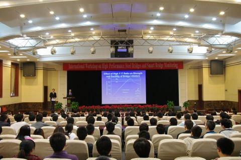 在此次研讨会上,国内外多名专家学者作了精彩的学术报告。首先由美国里海大学Joseph T.Stuart结构工程教授Richard Sause博士作了题为《高性能钢桥研究与应用》的报告。Richard Sause博士还是里海大学大型复杂结构国家工程研究中心主任,曾获美国土木工程学会J . James . R . Croes Medal奖、国际预应力混凝土学会Charles C. Zollman Award奖、美国混凝土学会Raymond C. Reese Structural Research Award奖等著名国际奖项。接下来舞阳钢铁有限责任公司技术部的刘利香工程师以及鞍山钢铁集团教授级高工侯华兴分别介绍了《舞钢高性钢研发与应用》和《鞍钢高性钢研发与应用》。下午一开场,张云峰副教授作了题为《基于压电漆传感器的桥梁智能检测与预测技术》的报告。张云峰博士现为美国马里兰大学副教授,马里兰大学结构实验室主任,并于2010年受聘为长安大学客座教授。最后,长安大学段兰博士也作了题为《高性能钢材料力学性能与混合钢梁抗弯性能试验研究》的报告。下午4时许,研讨会在师生们热烈的掌声中圆满结束。