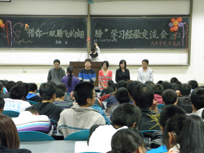 2010年10月24日晚,由我院举办的“借你一双腾飞的翅膀”2010级学习经验交流会在逸夫图书馆1201、1202、1203教室成功举行。本次交流会本着为大一新生消除困惑,指点迷津,帮助其尽早适应大学生活的宗旨,特地邀请了孙亚琴,赛立春,白岚,曹红,段晓琳等一批在学生工作,学科学习中都有着杰出表现的学长学姐来为大家答疑解惑。