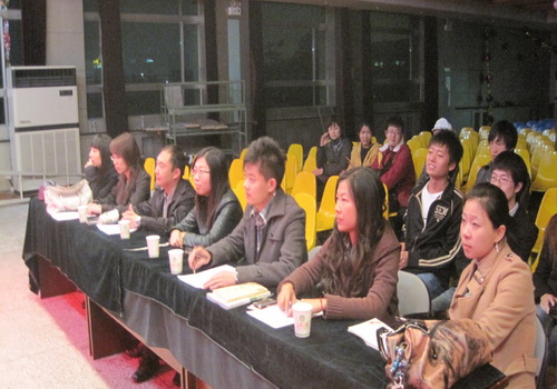 2010年10月25日晚,我院“心连新,心飞扬”研究生迎新晚会的节目预审活动在雁塔校区雁博园四楼多功能厅隆重举行。应邀出席活动并担任节目评委的老师有:学院办公室庞嘉林老师,2010级研究生辅导员李竑鋆、鲍良彦、牛倩倩老师和2007级本科生辅导员徐炯老师。院团委副书记沙莎、院研究生会主席焦丽莎、副主席王平一同担任了评委。本次节目预审以研一新生为主力,同时也吸引了研二、研三学生热情参与。预审节目有歌舞、相声、器乐、朗诵等多种形式。