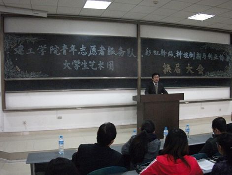 长安大学建筑工程学院青年志愿者服务队,彩虹驿站,科技创新与创业协会,大学生艺术团换届大会于2010年10月26日中午12点30分在图书馆1103教室召开。建工学院副院长袁卫宁、党委副书记刘世良、学生工作办公室主任李险峰、团委书记王树莹、副书记黄小乐,及08、10级辅导员参加了此次大会。本次会议由青年志愿者服务队社会服务部部长路畅主持。