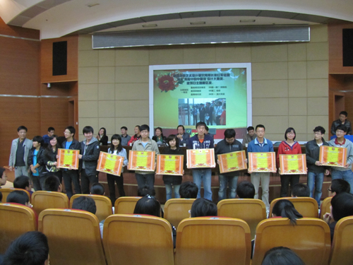 大会第二部分,首先,由学办主任李小芹老师宣读《2009-2010学年学生工作表彰决定》,随后学院领导为受表彰同学颁发了证书和奖品。通过对上一学年我院在学生工作的各项活动中的优秀成果和优秀人员进行表彰,起到了激励先进、树立榜样的目的。