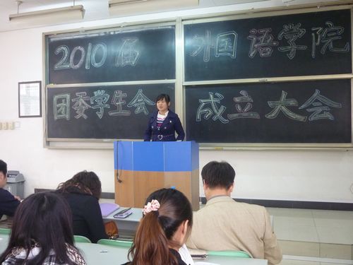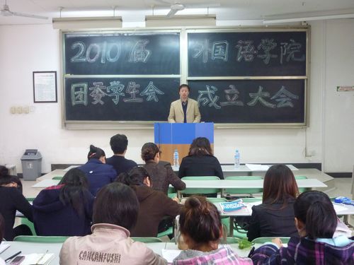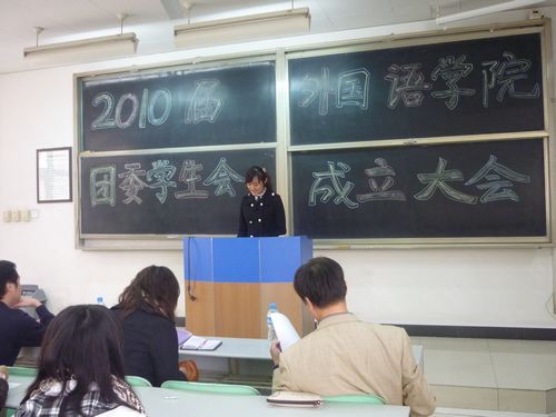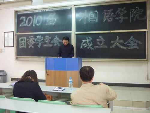 201010月31日下午3点,外语学院2010届团委学生会成立大会在渭水校区修远1203教室成功召开。参加此次会议的有外语学院党委副书记路志军、团委书记石松、辅导员黄钰杰及团委学生会的全体成员。本次会议由学生会办公室干事谢林余同学主持。