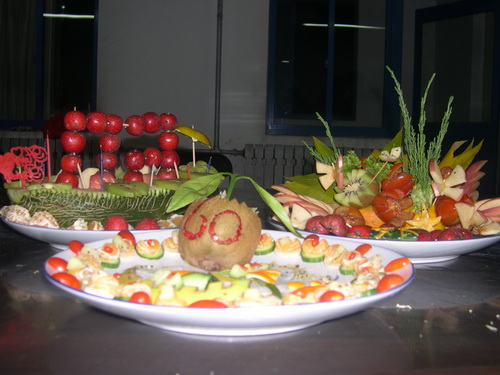 表现校庆六十周年的奇妙作品仍在一个个的上演,一次次精彩的解说使水果开始说话,在盘中央用绿色的黄瓜和橘黄色的细橘皮拼成的长大校徽惟妙惟肖,绿色的黄瓜片上粘带着橙片排在外侧,红色山楂在最外侧向内包围而来,中间经过雕琢的猕猴桃插上绿叶之后使整盘水果动了起来,鲜艳的色彩预示长大辉煌的明天。比赛最终将 决出一支最优代表队,他们将代表地测学院参加校级的竞赛。