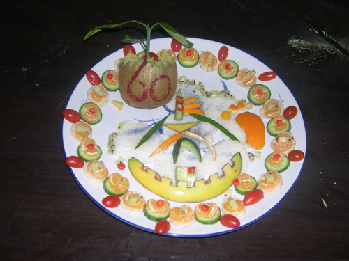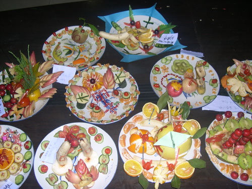 下午6时20分,各种水果的香味飘满了整个赛场,色彩的绚烂胜过春日的花朵,随着主办员开始的声音响起,各队队员迅速开始了竞赛,在25分钟之内,各具特色和意义的作品悄然而出。先是载着红色山楂的哈密瓜船迎向前来,用红色山楂拼成的“60”字样在黄色和绿色的映衬下格外醒目。随后用胡萝卜拼成的“古体木船”画一般的从写着迎校庆六十周年的桥下飘去,接着颇具传奇色彩的水果之花映入眼中,用红色山楂拼成的圆形“60”字样活灵活现,底盘的白色和细长的绿黄瓜使盘中央的水果花更显生机,中心的猕猴桃经过精妙的雕刻之后,变成了花芯,半椭圆形红皮黄肉的苹果片花瓣层层环绕在外侧,红色的火龙果组成的内侧花瓣为整个“水果之花”增添了生命的气息。表现校庆六十周年的奇妙作品仍在一个个的上演,一次次精彩的解说使水果开始说话,在盘中央用绿色的黄瓜和橘黄色的细橘皮拼成的长大校徽惟妙惟肖,绿色的黄瓜片上粘带着橙片排在外侧,红色山楂在最外侧向内包围而来,中间经过雕琢的猕猴桃插上绿叶之后使整盘水果动了起来,鲜艳的色彩预示长大辉煌的明天。