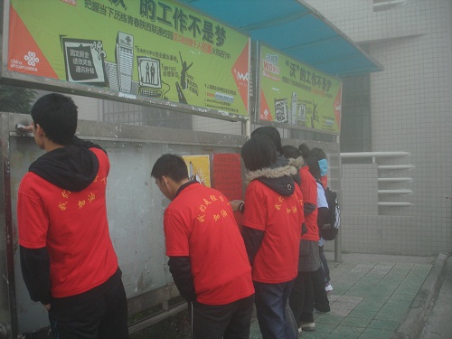 2010年11月31日,长安大学经济与管理学院大学生青年志愿者服务团在长安大学渭水校区开展组织展了以“清除小广告,洁净校园行”为主题的志愿服务活动,大志团全体成员参加了本次活动。