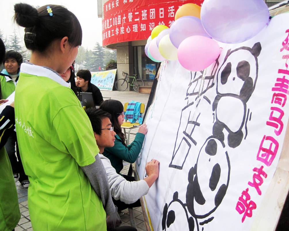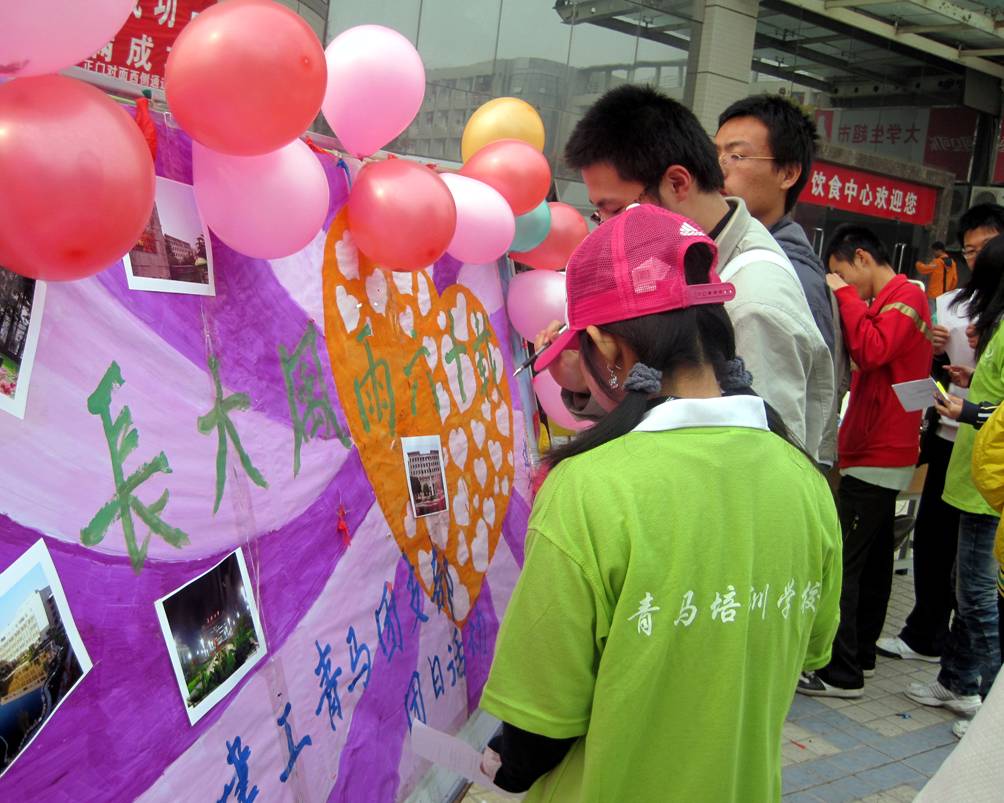 9:30分活动开始。本次活动围绕“长大风雨六十载”,通过在气球里面装带有问题与祝福的小纸条,以有奖回答的形式让过往同学参与是本次活动的一大特色。首先,经过所有参与成员的齐心协力,装有小纸条的彩色气球制作成功。后又经过一系列准备活动,系着彩色气球的展板“出炉”。在热情奔放的背景音乐下,身着草绿色青马队服的成员们开始热情礼貌邀请同学们前来。随着一声声“啪啪”响,小纸条便飞出。“你认为应该以什么样的方式爱国”等问题彰显了作为青马队员对国事的关心和对国家的热爱,一声声欢笑显示了青马队员们的强大亲和力。随着气球的减少,持续了近三个小时的活动也在一片欢声笑语中结束。
