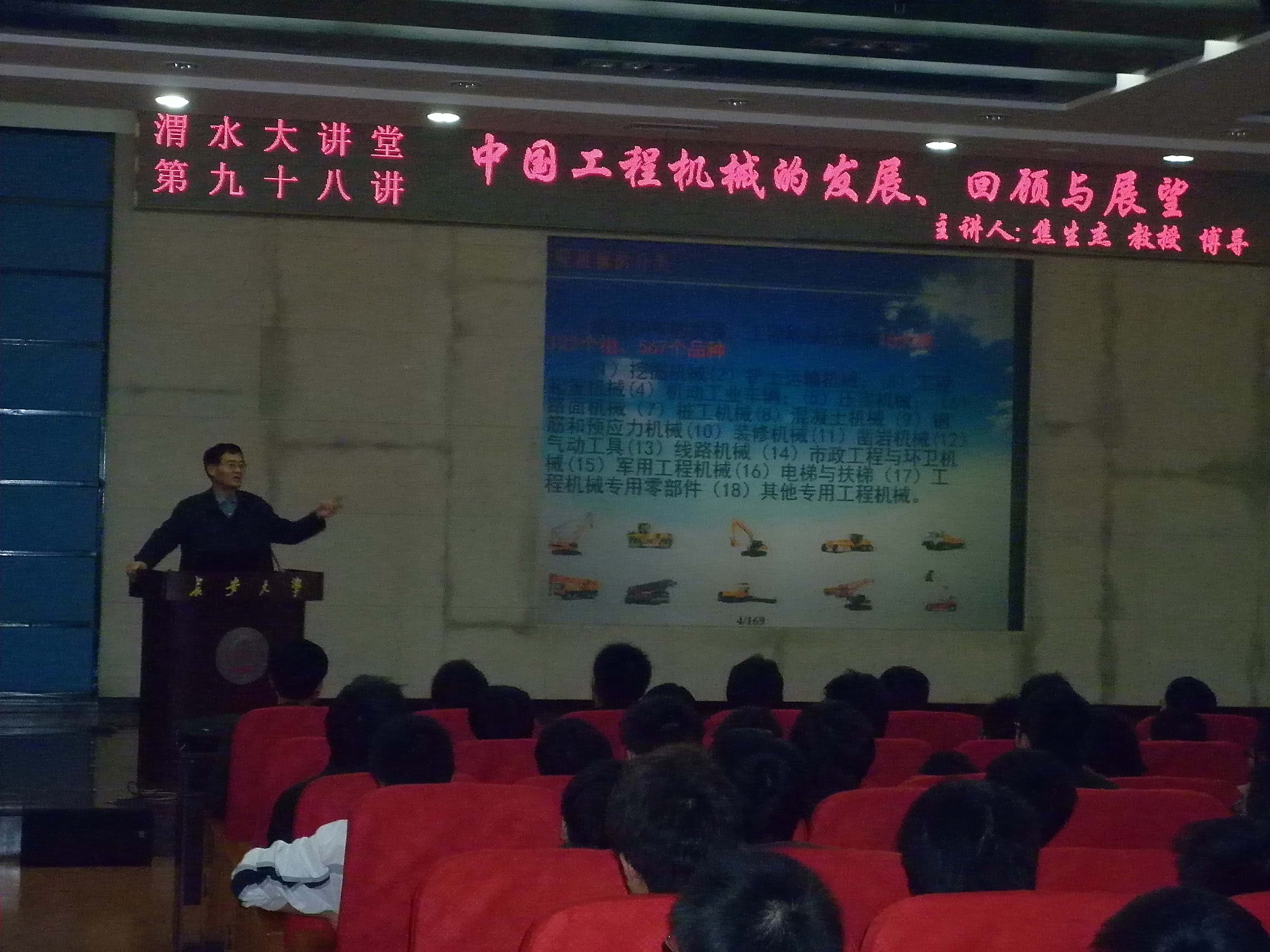2010年11月8日晚七时,由渭水校区管委会办公室主办、工程机械学院承办的“渭水大讲堂”第九十八讲在渭水校区会议中心学术报告厅成功举行。工程机械学院院长、博士生导师焦生杰教授作“中国工程机械的回顾、发展及展望”专题讲座。工程机械学院党委书记刘晓婷、副院长宋绪丁、副书记曾力、各年级辅导员老师及五百余名学生到会聆听,讲座由副院长宋绪丁老师教授主持。