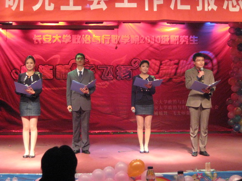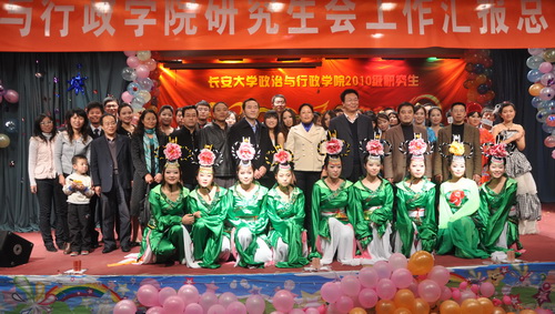 2010年11月10日晚,政治学院研究生会工作汇报总结暨2010级迎新晚会在校本部东院雁博园四楼多功能厅举行。应邀出席大会的校职能部门领导有校党委办公室主任彪晓红老师、校学工部副部长王冰老师、校宣传部副部长曾乐元老师、学工部研究生工作办公室主任张艳萍老师。学院党委书记王景荣、院长刘吉发、党委副书记田猛、副院长段联合、副院长吕宏强及贺桂华、刘春丽、桑业明等部分研究生导师共约三十余名老师也应邀出席了大会。学院各年级研究生和部分本科生参加了大会。本次工作总结汇报会暨迎新晚会由政治与行政学院主办、院研究生会承办。