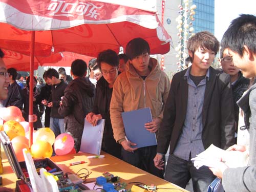 电科组设计了以电路为背景的展板,绘以人像加望远镜,寓意一起展望电子未来。此外还展示了专业器材,并制作了电脑性吉祥物,活泼传神,将本专业特色形象表达出来。智能组宣传台吸引了很多同学,热闹非凡,他们以寄语板、宣传板和互动游戏为形式,展示建筑设施智能技术。互动游戏又以有奖竞答和交流展望智能发展前景为内容,将此次台下比赛推向了高潮。智能组负责人10级智能2班班长郜桐雨告诉记者,“我们以自由为特色,宣传本系专业,虽经验不足,但我们用心举办活动”,参加竞答的徐同学说,”真的很有特色,有趣味而且充满专业知识。