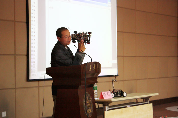 从06年飞思卡尔全国智能车大赛走进中国以来,韩毅教授就一直在为同学们做相关方面的指导,可以说韩毅教授的每一句话都包含着他对飞思卡尔的认识和热爱。讲座中,韩毅教授首先为大家讲述了飞思卡尔全国智能车大赛在中国的发展历程,其中也肯定了我校在过往大赛中所所取得的优异成绩,进步喜人。在谈及智能车时,韩毅教授兴致高昂的为大家作介绍,智能车分为A、B、C三种类型,分别在差速器方面有着各自不同的地方。展望明年的智能车大赛,赛事车辆、赛道和规则都有所变动,更重要的是明年的飞思卡尔全国智能车大赛的西北赛区将设在我校,届时我校选手将以东道主的身份参加比赛,更要求我们献出好的成绩。面对新的挑战,韩毅教授说道,同学们要勇于创新、勇于开拓、勇于冒险,每一个团队都要团结起来共进退。他也为大家立下了目标,那就是在明年的飞思卡尔智能车大赛中我们至少要拿下一个单项第一。韩毅教授诙谐幽默的话语无不激励在场的同学们,令每一个人的心底都激情澎湃。
