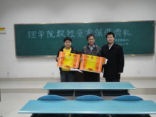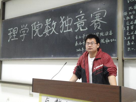 比赛主要分为初赛、复赛和决赛三个环节,随着比赛的进行,难度依次增加。在比赛中,我们可以看到选手们苦思冥想的表情,看着他们在稿纸上不断地演算的积极状态,我们能感觉到,为了能超越他人,每一个参赛选手都在尽力突破。经过三轮的激烈竞争,我们最终评选出了此次比赛的前三名。于17日晚七点,在明远3407教室,科协主席蓝岳青为各获奖选手进行颁奖。
