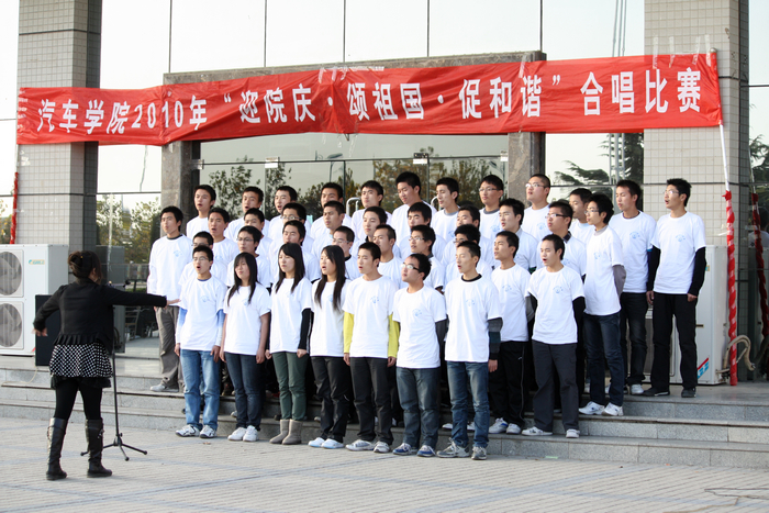 举办了“迎院庆、颂祖国、促和谐”迎新合唱比赛。学工部张艳萍老师、校团委郑玮华老师、汽车学院团委副书记郭咏梅老师、校学生会主席王垚同学和校大艺团合唱部部长杨得意同学担纲了此次大赛的评委。出席本次比赛的嘉宾有汽车学院学办主任杨杨老师、2009级辅导员黄国潮老师、2010级辅导员滑海宁老师。