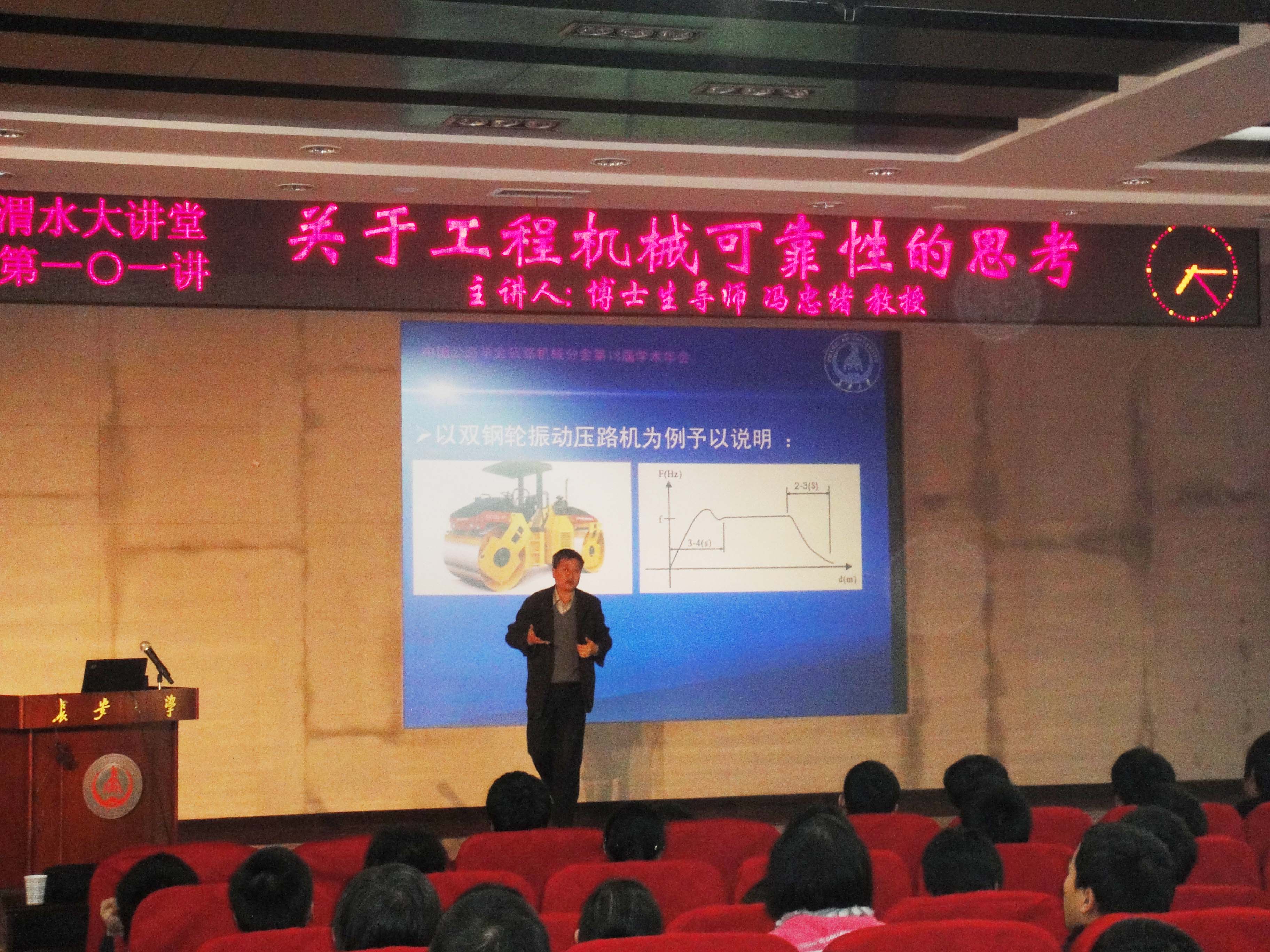 2010年12月1日晚7点,由渭水校区管委会办公室主办、工程机械学院承办的“渭水大讲堂”第一百零一讲在渭水校区会议中心学术报告厅成功举行。本次“关于工程机械可靠性思考”专题讲座由工程机械学院博士生导师冯忠绪教授主讲。工程机械学院团委书记朱武威老师,08级、09级、10级辅导员老师及五百多名在校学生参加了本次讲座。