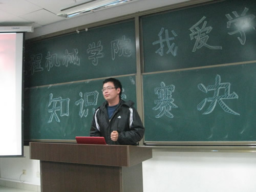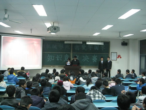 2010年12月16 日,机械学院“我爱学国学”知识竞赛决赛在明远3105教室如期举行。国学社主席汪思遥同学、机械学院学生会主席张立峰同学、副主席徐清刚同学、隋诺同学出席了此次大赛。
