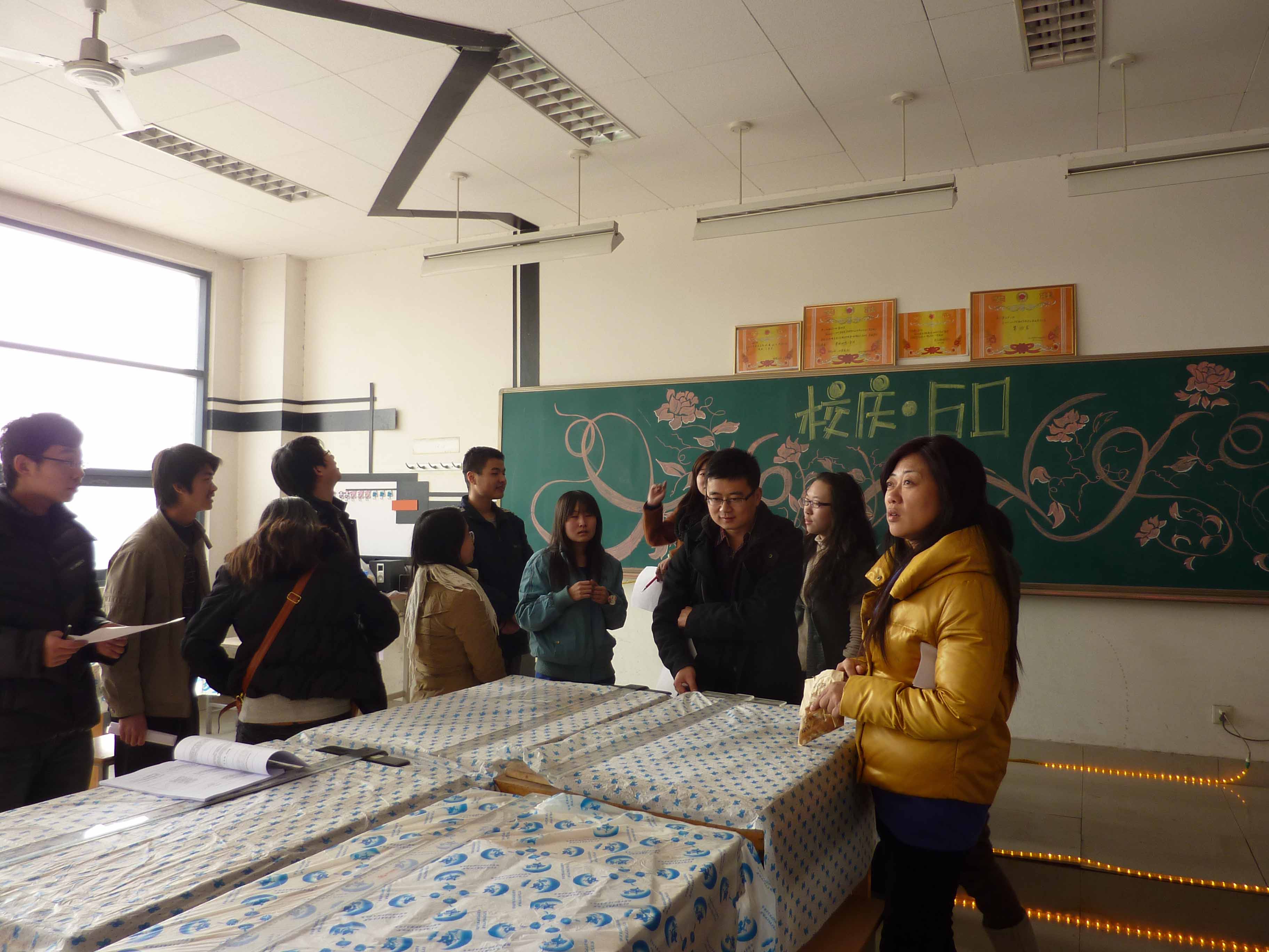 为庆祝长安大学六十周年生日,提高专教学习氛围,2010年12月中旬,建筑学院策划并举办了一场以“迎校庆六十周年”为主题的风采专教大赛系列团日活动,建筑学院所有同学以班级为单位参加了本次活动。12月21日中午,建筑学院党委副书记周文宁老师,学生办公室主任李小芹老师,团委书记刘鹏老师,08级辅导员王玉美老师及学生会部分成员担当了本次比赛的评委,参观并评比了各班专教。
