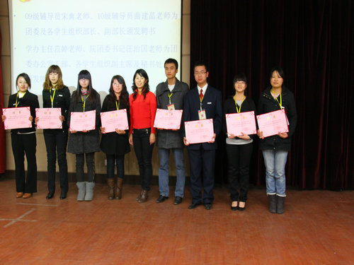 月27日晚19时,我院团委2010年度工作总结暨干部聘任大会在朝晖大学生活动中心三楼多功能厅圆满召开。院党委副书记田猛老师、学办主任范婷老师、院团委书记汪治国老师、09级辅导员宋典老师以及10级辅导员曲建晶老师应邀出席了本次大会。大会由院团委办公室副主任崔淑洁同学主持。