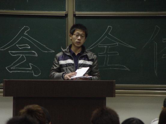 随后团委副书记徐晓娟就本学期的活动安排作了简要说明,并强调10级学生会干事应努力提高自身素质,发挥主人翁作用,积极建设学生会组织。副主席韩林则在讲话中,将上学期学生会成员的学习情况作了简要总结,强调学习是大学的主干,抓紧学业,并表示态度决定一切,要正视自身问题,勇于改正。