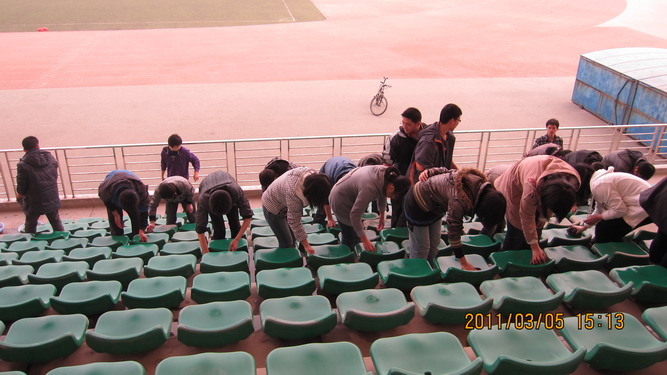 下午2时,全体成员在六号楼下集合。活动分为三个环节,首先,同学们在六号楼下摆放自行车。一段挥汗如雨的辛勤摆放之后,乱七八糟的自行车被摆放的规范整齐。接着,同学们向东区体育场进发,并沿路粘贴倡议书。旨在号召广大同学努力学习雷锋精神,继承传统美德,同时,也倡议大家规范摆放自行车。最后,同学们到达东区体育场,开始热火朝天地擦拭看台的座位。由于长期没有使用,座位上积了厚厚的灰尘,同学细心擦拭,看台座位焕然一新。在合影的咔嚓声中,活动圆满结束。