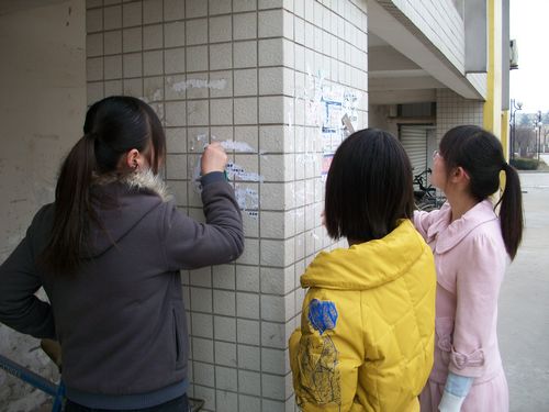 地测学院阳光志愿服务团的部分成员于2011年3月5日中午12点半在长安大学渭水校区11、12、13号男生宿舍楼下开展了一场阳光志愿服务活动,主要负责清理墙上的小广告和打扫地面及草坪。
