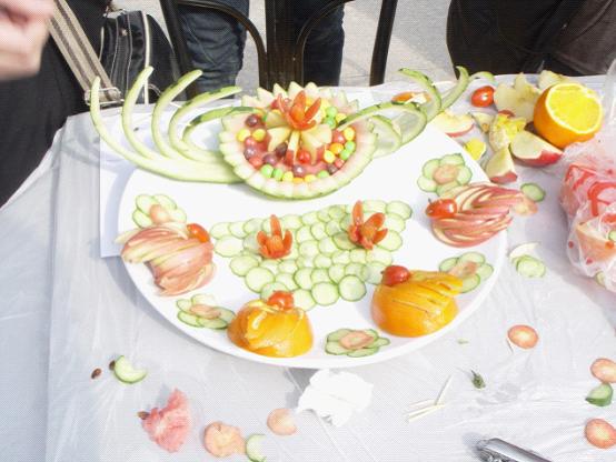 下午两点,各参赛队员按时到场,信心饱满。随着主持人的一声令下,趣味与压力并存的水果拼盘大赛拉开了帷幕。在激烈紧张的作品制作期间,各种娱乐活动也相继展开。踩气球,抢答环节等游戏妙趣横生,将全场气氛推向高潮。比赛进行45分钟后,水果拼盘大赛的制作环节宣告结束,作品中有体现“校庆特色”的雕花,有融入热情的夏威夷风情,还有创意无限的山水风景等等。各组作品精美细致,异彩纷呈,赢得了全场同学的一致好评。10届通信一班“飞扬三月,女生季节”获得此次大赛的一等奖,最佳创意奖则花落“花开富贵,百鸟争鸣”。
