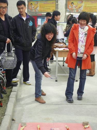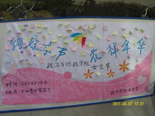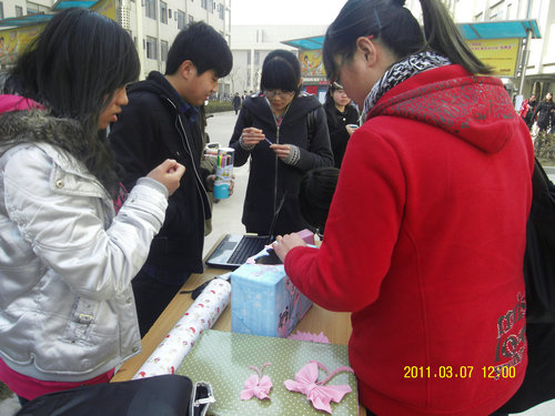 为发扬女生节传统,丰富校园文化生活,使我院女生在温馨的气氛中度过一个属于自己的节日,3月7日上午11:30,由我院团委主办、院团委学生会综合服务部承办的以“绚烂季节,花样年华”为主题的女生节特别活动在14号学生公寓楼下举行。院教务办雷娇老师、09级辅导员宋典老师、10级辅导员曲建晶老师应邀参加了此次活动。