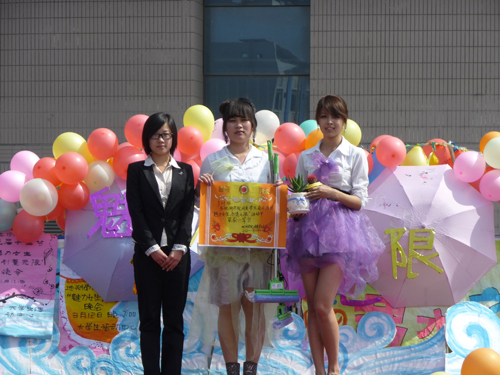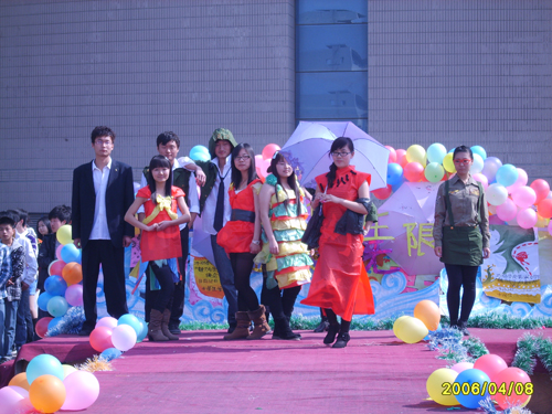 有梦就会有追求,首先展出的是701班的“红了樱桃,绿了芭蕉”,他们的服饰充满创意,同时又是‘绿色的’,1号红色的旗袍是由废旧的条幅做成,黑色的披肩由塑料袋做成,尽管如此,传统东方女性沉稳、温婉、睿智和端庄的形象还是完全的流露出来,2号则是身着宝塔裙,彩虹般的缎子洋溢着优雅,色彩一圈胜过一圈,强烈诉说着对梦想的无限热爱与执着追求,而宝塔裙的原材料正是塑料袋。3号的公主裙则更显现童话的纯真。5号6号7号的服饰都是以废旧军训服改创而成,5号在春季中收获清爽,6号的干练洒脱与柔软都悄然流露,7号则是英姿飒爽中透出女子的妩媚与柔美,最终701班获取三等奖。