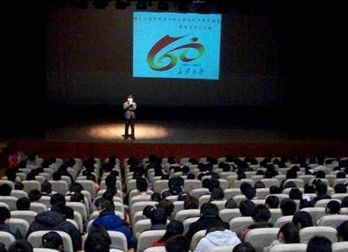 赵建斌老师首先结合自身在长大的学习与工作经历为同学们大致讲述了我校60年的校史。在场的同学们感受到了六十年的风雨历程,校园的风云变迁。一个甲子的时光里,母校在历届的校长以及杰出人物的带领下一步步迈向更高更远的台阶,屹立于各高校之间。他表示此次校庆是要为过去以及未来即将创造的辉煌而庆贺!他感慨的说,学校通过自身的内涵而感染学子,学子们则要怀揣一份感恩之情回报母校。四年的时间里,同学们在大学这个舞台上将会不断成长,培养兴趣,积淀出人生的底蕴!