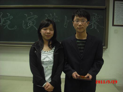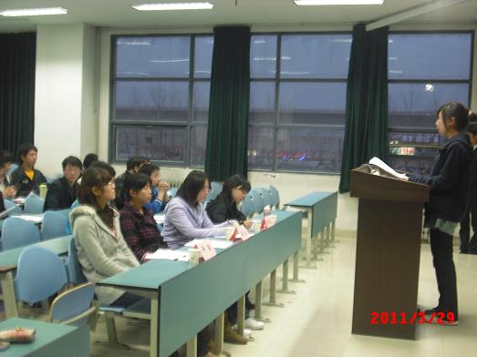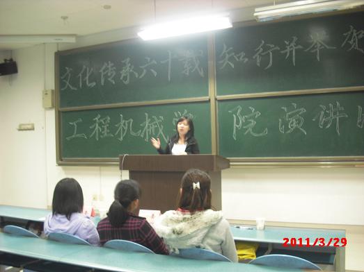 3月29日晚 ,工程机械学院主题为“ 文化传承六十载 ,知行并举贺校庆 ”的演讲比赛在明远3205教室如期举行。担当此次演讲比赛评委的是信息学院心协副主席、红楼梦文化社社员刘慧琪, 哲思辩论协会演讲部部长乔梦蕾,机械学院青年志愿者服务总队宣传部副部长、2010年工程机械学院辩论会决赛最佳辩手苗薇, 经管学院学生会学习部副部长莎颖洁。