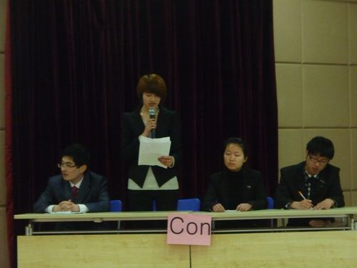 首先,外语学院学生会主席夏冬向大家致辞。她表示:我院一直以“关注科技,追求真理,锻炼口才、发展自我”为宗旨,积极举办外语角,外文歌曲大赛,精英讲堂等诸多精品活动,在我校60年建校之际,我院积极举办具有专业特色的庆祝活动,这些都展现了我院关注社会,积极向上的学子风貌,对提高同学们的各方面的能力有很大的帮助。最后,她希望选手们能赛出友谊,赛出水平,并预祝辩论赛取得圆满成功。