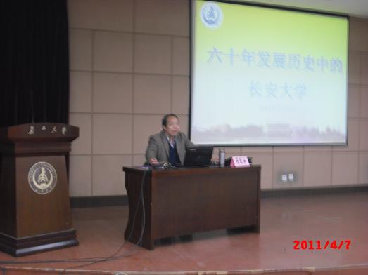 晩7时,讲座正式开始。段教授就长安大学六十年的发展历史进行了简要回顾,展示了我校在六十年发展中所取得的辉煌成绩,同时对我校在发展过程中遇到的问题进行了反思与总结。“弘毅明德,笃学创新”,六十年风风雨雨,长安大学一路走来,逐渐完善现代化高等教育系统,不断提升自身的科学研究水平和社会服务能力,培养了一批又一批的优秀人才,为我国的基础设施建设和地方经济发展做出了突出贡献。