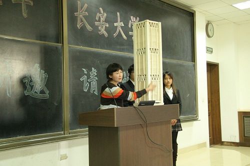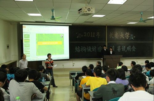 4月19日中午12:30,2011年长安大学结构设计邀请赛说明会在渭水校区逸夫图书馆东侧1102教室隆重召开。此次竞赛得到了各级领导的大力支持,以及同学们的积极参与。建工学院副院长袁卫宁老师,特色办主任王步老师,学院老师武贤惠、熊二刚,建工学院团委书记王树莹、副书记黄小乐老师出席了此次会议,参加会议的还有西安理工大学、西安工业大学、西安石油大学的科协代表及我校约70支参赛队伍。