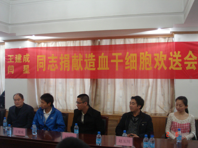 欢送会结束时,王建成同学在学院领导和其班上八名同学的共同陪同下,参加陕西省红十字会举行的的欢送仪式并捐献骨髓造血干细胞。