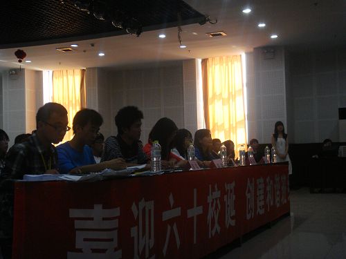 为迎接我校60周年校庆,由理学院团委主办彩虹驿站承办的“喜庆六十校诞,创建和谐班级”班级风采展评比大赛的初赛于4月24日下午2点半在大学生活动中心多功能厅举行。我院团委书记汤颖颖老师,辅导员孙莺纯老师,地测学院团委副书记及各兄弟学院彩虹驿站的负责人出席活动并担当评委。