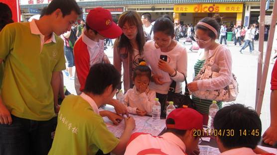 上午8时,青马班的全体成员到达火车站。接着,成员们分成了五组,分别负责协助乘警维持售票窗口、检票口、进站口、出站口以及公交引导处的秩序。青马班的成员们或耐心指引乘客购买火车票;或积极引导乘客有序进入火车站;或维持人流秩序,使乘客顺利快速出站;或向需要的人们发放印有公交线路的宣传单;或展开地图,为出行游览的人群指明公交路线,乘车地点。灼灼的烈日使成员们汗流满面,但大家的脸上却绽放出青春的光华,大家都积极地表示:“劳动最光荣,志愿最给力!”