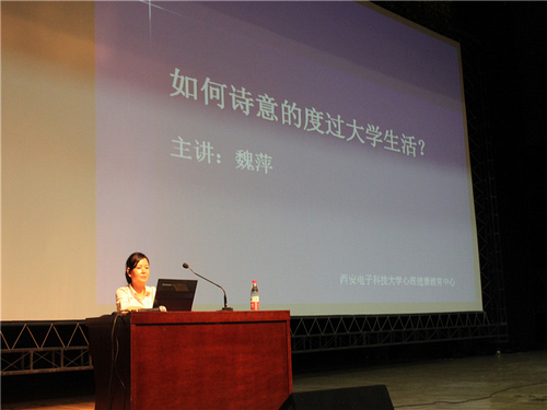 2011年5月11日晚7时,西安电子科技大学心理健康教育中心魏萍副教授应邀在我校朝晖大学生活动中心礼堂作了题为《如何诗意的度过大学生活》的精彩讲座。讲座由我校心理健康咨询中心主任贠丽萍老师主持。校心理健康咨询中心的蒋世良老师、王赟老师,我院09级辅导员宋典老师、10级辅导员曲建晶老师以及我校广大学生参加了此次讲座。