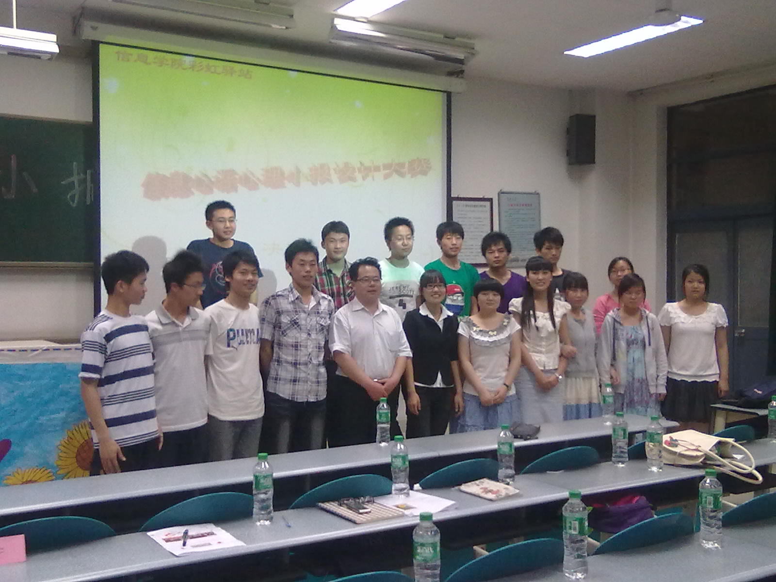 2011年5月12日晚,信息学院彩虹驿站主办的“第一届信息心语心理小报设计大赛”在明远1406教室成功举办。我院党委副书记杨玉龙和学办老师担任此次比赛的评委,青年志愿者服务总队信息学院分队主席李海寿等学生代表出席了此次比赛。