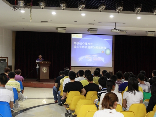 接着,由研究生山宏宇同学向大家作关于《高速铁路无渣道核心技术之CA砂浆技术》的报告。他提出CRTS-II型轨道结构的应用解决了高速公路和铁路所面临的问题,接着他还从CRTS-II型CA砂浆的性能、组成、应用、研究现状和发展前景方面向大家作了具体的介绍。之后大家也都积极提问,互相探讨。