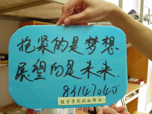 2011年5月8日至5月13日经管学院彩虹驿站“心灵舍语”征集活动顺利举行。本次活动是我院“心理文化进宿舍”的一部分,旨在提高宿舍同学的凝聚力、增进彼此的友谊、彰显我院学生积极向上、健康美丽的心灵,让每一个学生的宿舍有一个亮丽而又独特的“心灵舍语”。