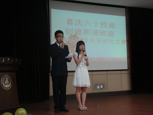 大赛分为“班级展示”和“班级才艺”两个环节。首先,入围决赛的各个班级利用他们精心制作的PPT分别从思想建设、组织队伍建设、班风学风建设、开展活动、所获荣誉等方面进行展示,并结合自己班级建设特色,以生动丰富的语言向评委和观众展示了班级风采。在“班级才艺”环节,各个班级分别以朗诵、合唱等表演形式为评委和嘉宾带来了震撼的视觉和听觉感受。特别是09工力班的男声合唱《中国军魂》,气势磅礴,令人振奋。