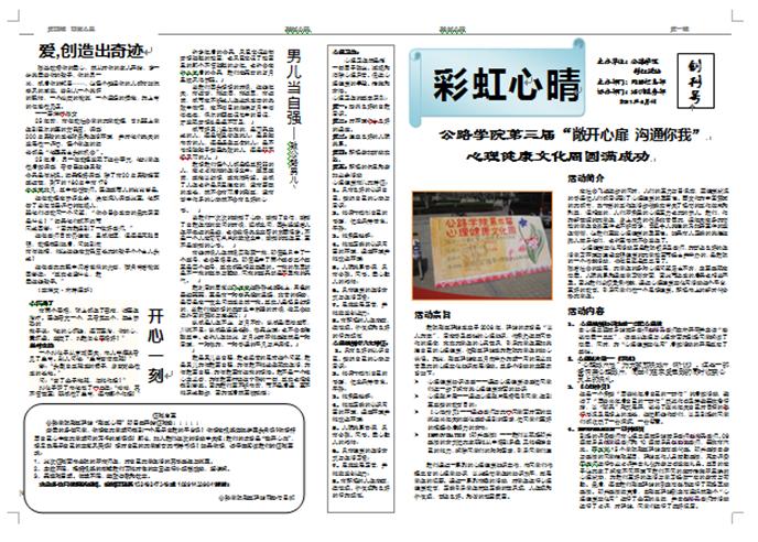 小报以普及心理健康知识为主旨,通过驿站动态、心理密码、心理知识、百家心理等主题版块设计,由公路学院彩虹驿站网络信息部设计,通过公路学院彩虹使者发往大一、大二、大三各班级宿舍,使同学们更方便、更快捷的了解心理学和心理健康的相关知识,提高广大学生对心理健康的兴趣和正确认识,帮助大家以健康的心态面对学习以生活。