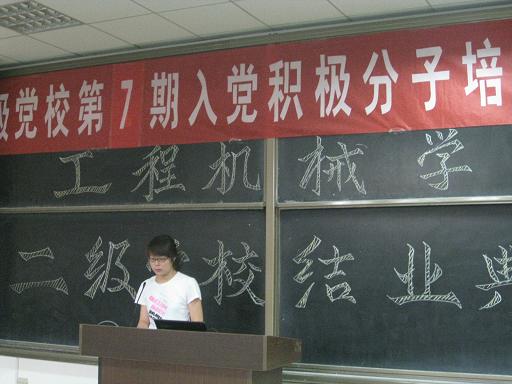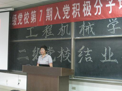 2011年6月2日晚,工程机械学院二级党校第七期入党积极分子培训班结业典礼在WT1102教室隆重举行。工程机械学院党委书记刘晓婷老师,党委副书记曾力老师、杨密侠老师,学办主任程宝虔老师,2008级辅导员赵良臻老师,2009级辅导员杨鹏老师,2010级辅导员王博老师出席了此次典礼。典礼由党委副书记杨密侠老师主持。