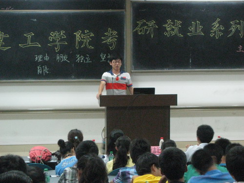 2011年6月9日,由建工学院团委主办的考研与就业系列讲座在图书馆东侧1101教室顺利召开。讲座旨在通过考研成功的同学的经历激励后人,并将成功的经验化为后人前进的宝贵财富。07届成功考入同济大学、重庆大学、西安建筑科技大学的部分同学,以及建工学院08级、09级部分同学出席了本次讲座。