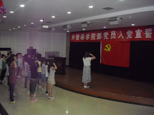 2011年6月9日下午四点,我院在朝晖大学生活动中心三楼多功能厅顺利举行新党员入党宣誓仪式。本次仪式由党委副书记路志军主持,党委书记魏一虎,团委书记石松,辅导员黄钰杰,全体党员,入党积极分子及我院其他学生参加了此次宣誓仪式。