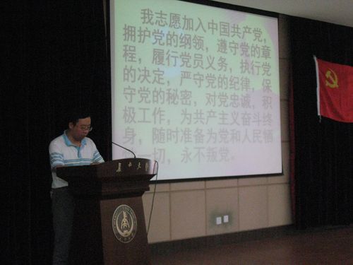 09级生物工程班王博同志代表新入党的同志发言并郑重向党组织表示:他们将坚持不懈地提升自己的思想政治修养,始终保持解放思想,实事求是,特别是与时俱进的精神状态,充分发挥党员的先锋模范作用,做塑造良好学风、班风和校风的模范,为文明校园建设、维护学校院系稳定等各项工作,做出自己一份应有的贡献。