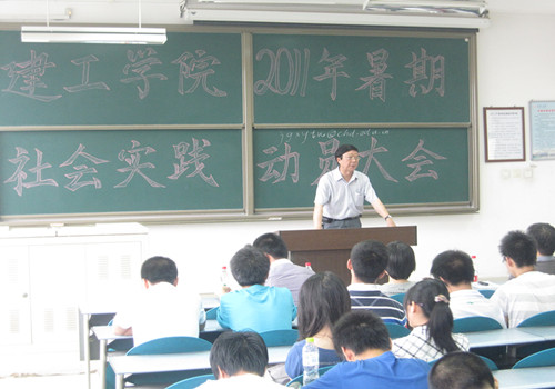 2011年7月5日在明远1401教室我院召开了“建工学院2011年暑期社会实践动员大会”。党委副书记刘世良老师,团委书记王树莹老师,团委副书记黄小乐老师,以及辅导员索源、谢尚佑老师出席了本次大会。