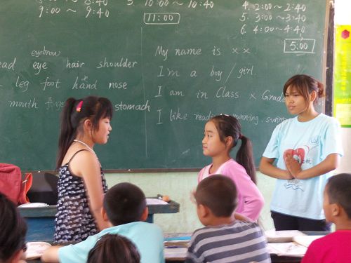 8日上午7时许,实践队员们就到教学楼前悬挂了“爱启航”暑期社会实践队队旗,耐心等待同学们到来。8时许,操场上已经集合了近两个班人数的学生,在教务处曹主任的统一指挥下,同学们有序进入教室,准备上课。一声哨响,两个班同时开始上课,主要课程有英语、数学、艺术欣赏等。实践队采用学生自主学习为主的教学方式,激发学生们的学习兴趣,开阔学生们的视野。特别是英语课,主要以学生们上台讲英语,老师在一旁纠正发音为主,这样既锻炼了他们的英语口语水平,也提升了他们在众人面前演讲的胆量。